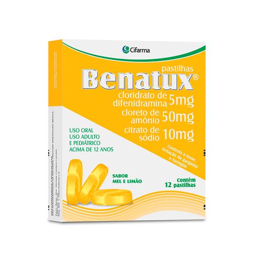 Benatux é um medicamento anti-inflamatório, com 12 pastilhas no sabor menta, de uso adulto e pediátrico acima de 12 anos, sendo indicado para tratar irritações, como tosse, dores de garganta, além de rinite e outras alergias.