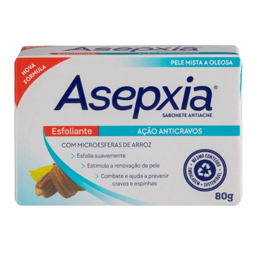 Asepxia Esfoliante é um sabonete antiacne em barra, que elimina a oleosidade, desobstrui os poros, diminui o aparecimento de cravos e espinhas, além de deixar uma pele limpa e com aparência uniforme. Sua fórmula possui microesferas esfoliantes que ajudam na renovação da pele sem agredi-la. Além disso, conta com Extrato de jojoba, um ingrediente especial que repõe a umidade perdida e reduz a aparência das rugas retardando o envelhecimento e proporcionando elasticidade e firmeza à pele.