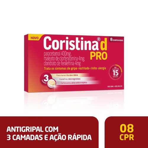 Para que serve: Coristina D é indicada no tratamento dos sintomas do resfriado comum e da gripe (dor de cabeça, dor no corpo, febre, coriza, espirros e obstrução nasal).