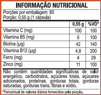 Ácido ascórbico, bisglicinato de zinco, bisglicinato ferroso, D-pantotenato de cálcio, D-biotina, cianocobalamina e antiumectante talco. Composição da cápsula: gelatina e corante dióxido de titânio.
