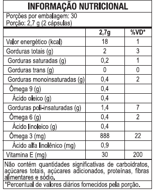 Óleo de linhaça, óleo de prímula, óleo de semente de borragem e acetato de DL-alfa-tocoferol). Composição da cápsula: agua purificada, gelificante gelatina e umectante glicerol.