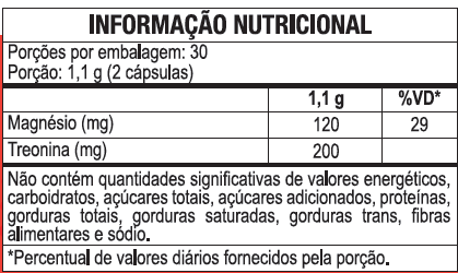 Bisglicinato de magnésio, L-treonina e antiumectante talco. Composição da cápsula: gelatina.