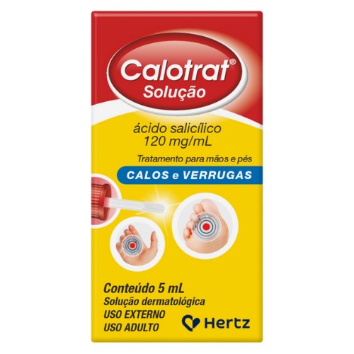 Calotrat Solução: Queratoplástico indicado no tratamento de verrugas comuns, plantares e calosidades. Uso externo. Proteger as áreas ao redor da lesão e aplicar, uma vez ao dia, quatro camadas de colódio, esperando cada camada secar antes da reaplicação, até a eliminação da verruga ou calo.